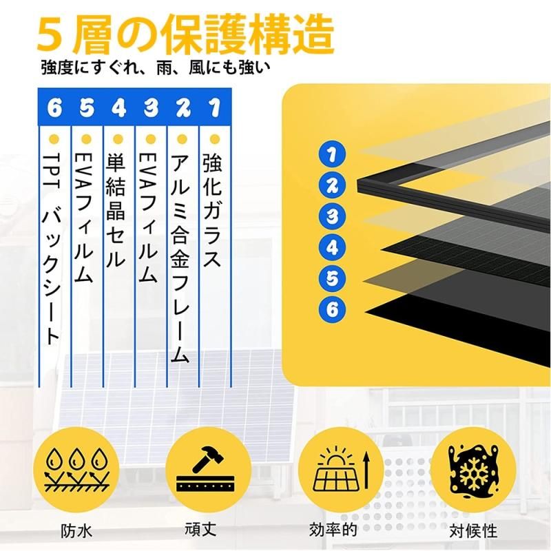 【高変換効率】単結晶セルの採用により、最大24%を実現いています.一日の発電量は大体400whで、設置環境によって発電量が異なり、より安定した発電性能と効率的な光電変換を備えています。逆流防止ダイオードが付属しております。