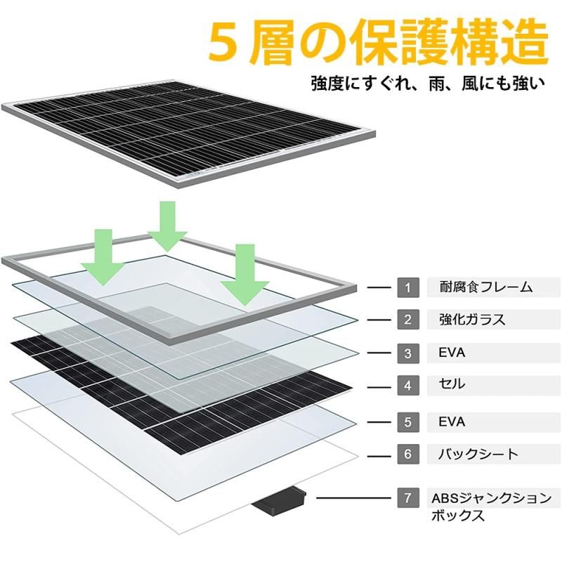 【耐久性】パネルは5層+腐食しにくいアルミフレームで構成!表面は3.2mmの低鉄ガラスで構成されて強風(2400Pa)および雪荷重(5400Pa)に耐えます。外の高温時や積雪の日などでもしっかりと発電できます。高い発電効率を維持し、防水耐久性を確保し、ソーラーパネルの耐用年数を延ばします。