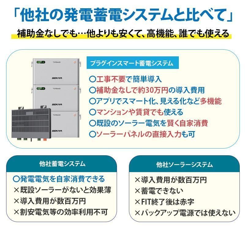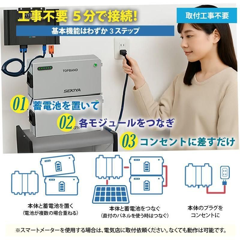 逆潮流防止機能が搭載されているため、安全性にも配慮されています。このシステムは、省スペースで設計されており、屋内外にスマートに設置可能。環境に優しく、経済的な自家発電をこれから始めたい方に最適な選択です。日々の生活において、安定した電力供給を求めるすべての家庭に、この革新的な蓄電システムをお勧めします。