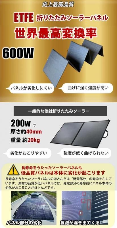 アウトドア活動や非常時のバックアップ電源として、または日常的なエネルギーコストの削減にも最適なこのソーラーパネルは、持続可能なエネルギー源を求めるすべての方にお勧めです。防水機能も備えているため、雨の日でも安心して使用できます。高性能とポータビリティを兼ね備えた折りたたみソーラー600Wは、あなたのエネルギー需要を革新的にサポートします。